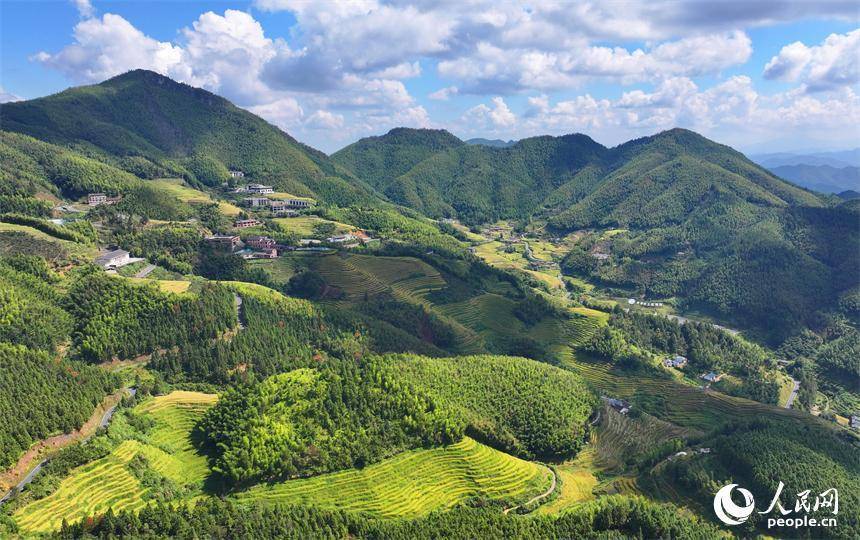 赣州市崇义县上堡乡,层层叠叠的梯田沿山体绵亘蜿蜒,与错落分布的农家房屋、旅游民宿相映成画。人民网 朱海鹏摄