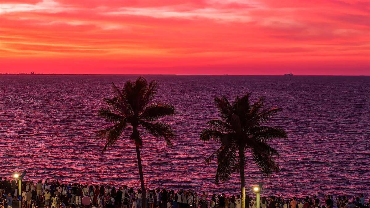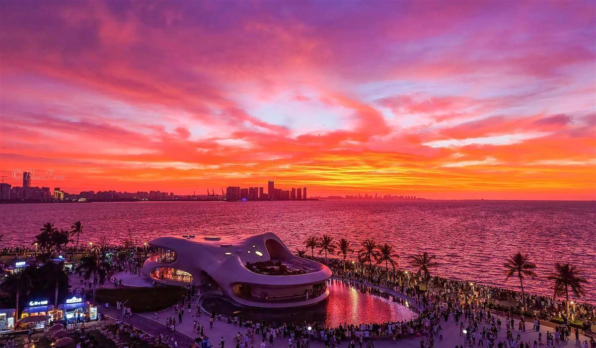 10月4日晚,海南市民纷纷在朋友圈刷屏,台风“麦德姆”登陆之前,海南天空出现世纪晚霞。海南著名景点三亚椰梦长廊,整片天空都被晚霞染红,大海也被晚霞染得绚丽多彩。